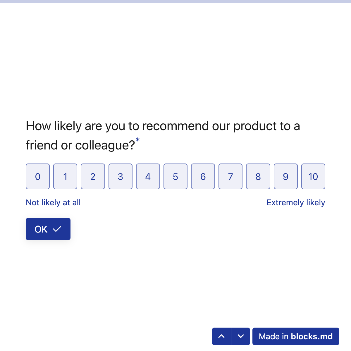 An opinion scale allows the user to input how likely they are to do something, such as recommending a product for example. When using the default parameter values, the opinion scale is a [Net Promoter Score®](https://en.wikipedia.org/wiki/Net_promoter_score). Here's a opinion scale with only the required parameter(s):