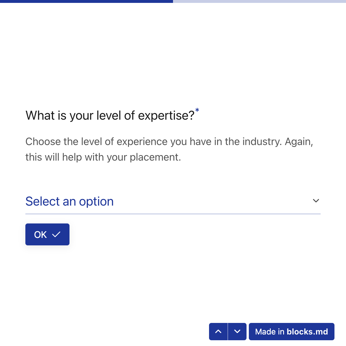 A select box is an input element that lets the user select a single item from a list. For multi-select, please use a [choice input](https://blocksmd.gitbook.io/docs/choice-input) with the `multiple` parameter. Here's a select box with only the required parameter(s):