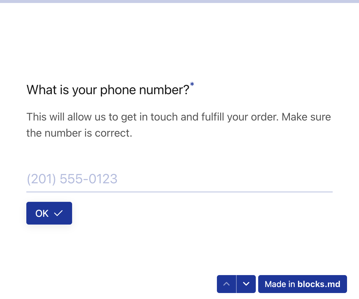 Also note, this does not add any validation rules to the input—only the placeholder is affected. For custom validation of your phone numbers, please use the `pattern` parameter. For a full list of usable country codes, please see [`src/phone-number-placeholders.js`](https://github.com/blocksmd/blocksmd/blob/main/src/phone-number-placeholders.js).